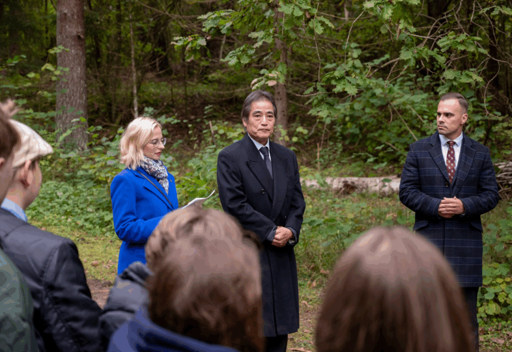 Paneriaiでの追悼行事の1週間後、今度はトラカイという、湖上の美しい古城で有名な町の市長から筆者は招待を受けました。それは、同市でもホロコーストの追悼行事を行うので日本大使としてスピーチをして欲しいとの依頼でした。当日、赴いてみると、町の中心から車で数十分離れた森の中にある記念碑で、既に数十人の中高生が集まっていました。市長は中高生達に、同地でリトアニアの住民が手を貸す中でユダヤ人の殺害が起きたことを説明し、その一方で、杉原という日本の外交官がいてユダヤ人を救ったと述べました。筆者からは、第二次大戦中、日本はアジアで加害者の立場でもあったことに言及しつつ、その中で杉原という人道主義に基づいて行動した外交官がいたことを誇りに思う等々述べました。
